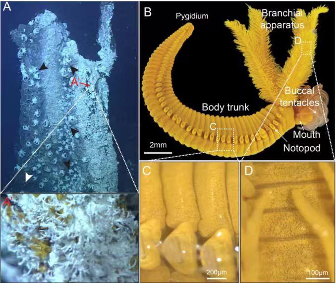 A:贺氏拟阿尔文虫生存的深海热液烟囱,其中A’暴露热液喷口近邻的贺氏拟阿尔文虫群落;B:贺氏拟阿尔文虫个体;C和D:贺氏拟阿尔文虫躯干及头冠皮下表的亮黄色颗粒。