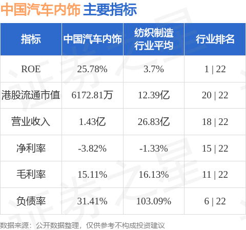 中国汽车内饰港股市值6172.81万港元,在纺织制造行业中名循序20。主要成见见下表: